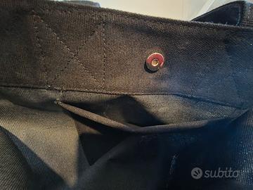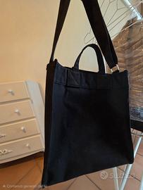 Tote originale molto capiente in canvas pesante con bordi rinforzati . interno plastificato , taschino e 1 bottone a pressione come chiusura . Doppi manici e tracolla regolabile.