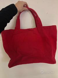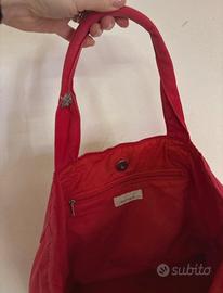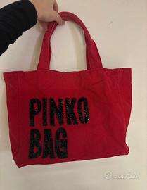 Borsa Pinko rossa con manici e scritta con paillettes nere. Usata pochissimo