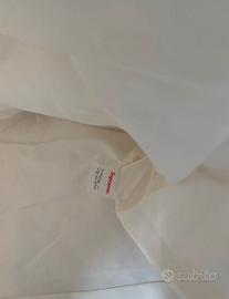 Supreme tote in cotone pesante Bianca. tela con todera in twill di cotone e chiusura superiore con zip. Tasca interna con cerniera e tasca aggiuntiva sul davanti. Etichetta con logo in tessuto sul davanti. misure 45×35×15 Nuova mai usata