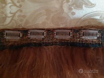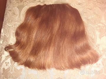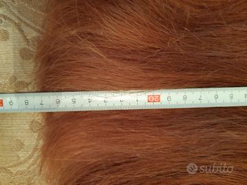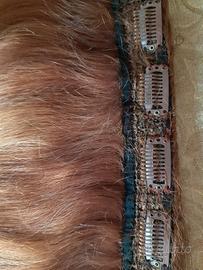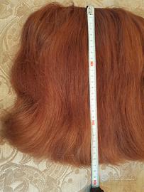 Toupet 100% capelli veri, montati su quattro pettinini. Possono essere piastrati, messi in piega e tinti. In perfetto stato, i capelli sono fini e ondulati di colore rosso ramato.