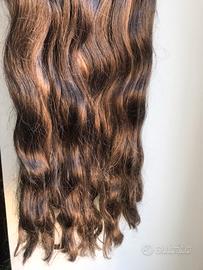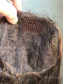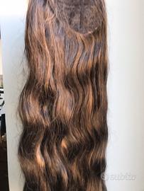 Toupet di capelli sintetici lunghezza 70 cm, castani con colpi di sole dorati, realizzato su misura dal salone di Mario Audello di Torino. Ha la calottina con pettinino per fissarlo sui propri capelli. In perfetto stato, i capelli fini e ondulati, sono pettinabili e sembrano veri. Molto bello