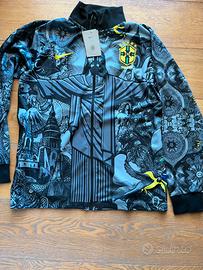 Vendo tuta Nike della nazionale brasiliana, composta da giacca e pantaloni. Design unico in nero e grigio con dettagli gialli, ispirato al celebre Cristo Redentore. La giacca presenta una grafica dettagliata e ricca di simboli, mentre i pantaloni sono semplici confortevoli, entrambi con logo CBF ricamato. Taglia l condizioni nuove con cartellino