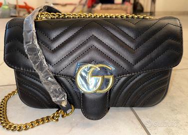 Borsa nera con doppia G e tracolla a catena sfaccettata e da silhouette contemporanee.