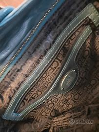 vera pelle color petrolio, interno foderato, tasca con zip