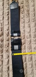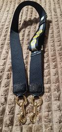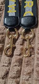 Tracolla regolabile in tessuto nero con una striscia centrale argentata e glitterata, su cui è ricamato il logo "MARC JACOBS" in giallo neon. Materiali: Realizzata in poliestere (circa 94%) e materiale metallico (6%), con finiture in pelle nera alle estremità. Dotata di minuteria metallica dorata, inclusi i moschettoni a scatto e la fibbia per la regolazione della lunghezza. Dimensioni: La lunghezza è regolabile, variando generalmente tra i 98 cm e i 145 cm circa, con una larghezza di 5 cm. Come nuova, per qualsiasi domanda sono a disposizione.