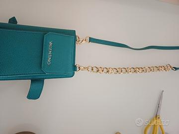 Bellissima borsa portafoglio Mario Valentino color tiffany con lettere dorate molto fashion piccola usura sulla tracolla