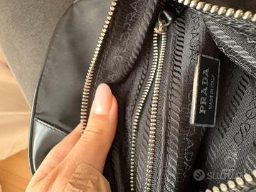 Borsa Prada Vela vintage a tracolla in nylon nero con dettagli in pelle, modello primi anni 2000.