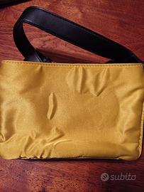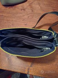 tracolla di pinko di colore verde acido con 2 inserti sul davanti di pietre nere e bianche con tracolla di pelle nera. La borsa è dotata di 2 scomparti
