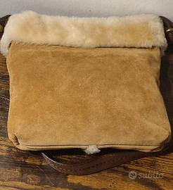 Borsa crossbody UGG Australia, al 100% pelle scamosciata con rifiniture in montone, colore castagna, tracolla regolabile, chiusura a calamita, con tre tasche, di cui una con cerniera, fodera jacquard con logo, charms in metallo dorato. Ottime condizioni generali, segnalo che la pelle della tracolla ha dei punti più scuri (ultime foto).