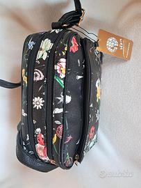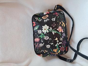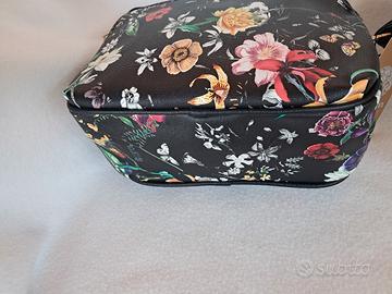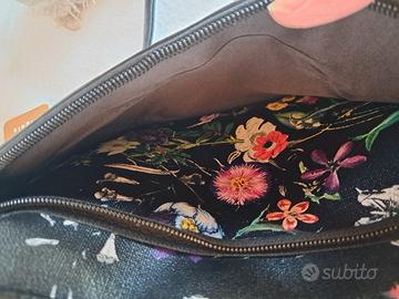 1 tasca frontale chiusa con cerniera; la parte visibile della tasca è dello stesso materiale della borsa: nero a fiori colorati