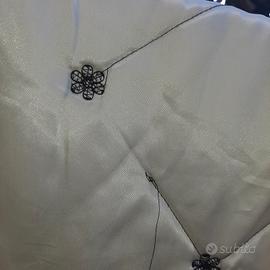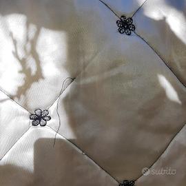 Trapunta leggera, primaverile, in raso bianco, matrimoniale, con voile alto su 2 lati. Condizioni discrete. Ha solo pochi cm di voile corto e qualche riga nera del disegno, un po scucite