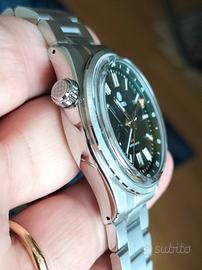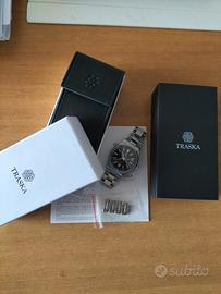 Vendo Traska Venturer GMT. Cassa da 38,5mm con spallette forate, vetro zaffiro box, calibro Miyota premium 9075 vero GMT a 28.800 a/h. Ghiera girevole interna comandata dalla corona a ore 10. Il bracciale ha perni a vite, finali e scatoletta a regolazione rapida tutto in acciaio pieno. Le due corone e il fondello sono serrati a vite, WR 150mt. L'acciaio della cassa e del bracciale sono trattati per una durezza eccezionale certificata a 1200 vickers. L'orologio è full set, in condizioni di pari al nuovo. Non scambio con Seiko Citizen Longines Rolex Tudor Tissot Glycine Certina Hamilton Mido Nivada Steinhart Armida Borealis Bulova. Gradito e preferibile il ritiro a mano su Padova Verona Vicenza Rovigo, spedizione disponibile.