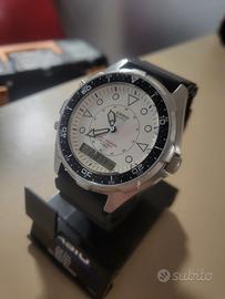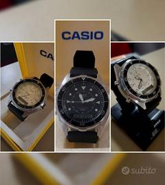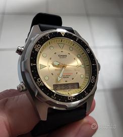Casio 'Arnie', uno con sfondo quadrante nero, uno sfondo bianco e uno "champagne" in ottime condizioni. (In quello bianco, il tasto superiore sinistro è un po' duro, a seguito di una riparazione nella plastica interna). Quadrante analogico/digitale, WR 100 metri, cassa e fondello in acciaio. Cinturini e scatole originali, tenuti benissimo, perfetti. Versione piuttosto ricercata, in quanto (essendo destinati al mercato europeo) non presentano il tasto laterale a destra sotto la corona, ma due laterali a sinistra della cassa. Il modello è famoso in quanto è stato usato da Arnold Swarzenegger in vari film. Esteticamente messi piuttosto bene, presentano solo qualche piccolissimo segno di usura d'uso. Quello con quadrante nero viene venduto con scatola blu scuro, quello quadrante "champagne" con scatola gialla, quello bianco sul supporto nella foto. Posso venderli singolarmente, ma il prezzo cambia, sono già presenti tra gli articoli in vendita.