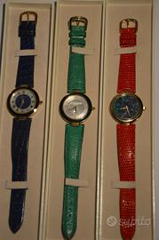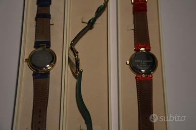 Tre orologi da donna Pierre Balmain con segni di usura assenti o appena visibili. Sottilissimi, placcati in oro, con scatole originali. In vendita anche singolarmente. Necessitano di una nuova batteria tolta dagli orologi quando gli stessi vennero dismessi. Cinturini perfetti, con scatola originale.