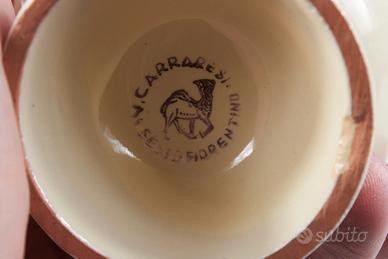 Queste tre tazze in ceramica artistica databile agli anni ’30 sono state prodotte dalla storica Ceramica Carraresi di Sesto Fiorentino (Firenze), una realtà oggi oggetto di studio e conservazione negli archivi locali per l’importanza delle manifatture attive nel primo Novecento.