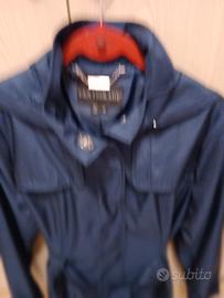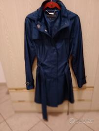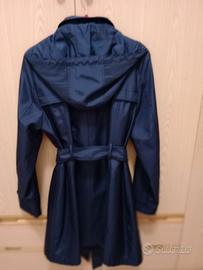 Soprabito donna blu con tasche bottoni a pressione, cintura e cappuccio.Ottimo tessuto