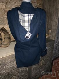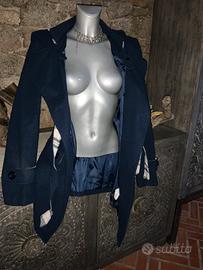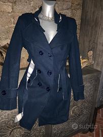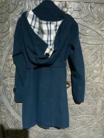 Tg.XL, ma si adatta anche a taglie inferiori con effetto un poco più over, colore blu marino, misto lana e poliestere, molto morbido, fodera interna, tasche, doppio petto con bottoni e cintura, cappuccio rimovibile con interno scozzese bianco e blu, molto carino ed originale!