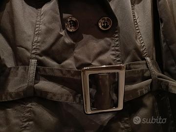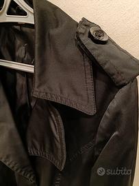 Trench da donna corto doppiopetto, tasche laterali, cintura con fibbia, bottoni, colore nero. Anche impermeabile per la pioggia.