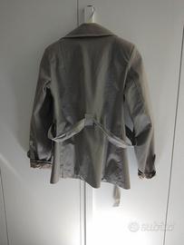 Trench corto da donna in cotone tinta unita. Chiusura con bottoni e cintura, sono presenti le spalline. Colletto a camicia e tasche laterali. E' presente una piccola scucitura nella fodera interna, 2 cm circa. Taglia M ma non calza molto.