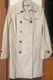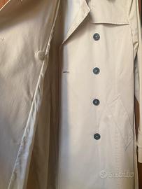 Trench beige doppiopetto in gabardina, taglia 40 maniche lunghe con alamari e cinturino al polso, tasche laterali a filetto. Allacciatura tramite bottoni. Cintura coordinata in abbinamento. Capo foderato