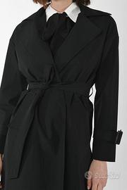 Trench oversize lungo in tessuto nero con revers classici, design sovrapposto, cintura da annodare alla vita, tasche laterali, cinturini regolabili ai polsini e spacco al centro dietro.