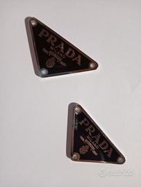 coppia triangoli Prada originali, in metallo argentato e nero. Possibilità di realizzare orecchini o ciondolo per collana. Può essere cucito su cappelli, cerchietti per capelli, giacche,vestiti o borse in genere.