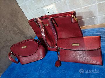 Trio di borse corredate, colore rosso scuro, nuove, ancora nell' incartamento. Ottimo prodotto da regalo.