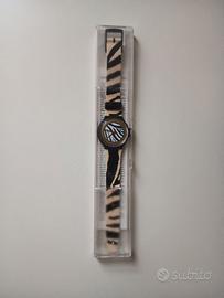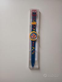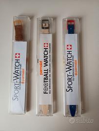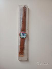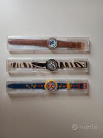 Vendo 3 orologi Swatch inizio anni 90 ancora nella confezione originale (per cui mai usati). Sono orologi gadget della Parmalat in collaborazione con Swatch per una raccolta punti Parmalat. Trovati in una cantina, non li ho puliti non vorrei rovinarli, non mi intendo di restauri. Quello marrone ha la confezione con un paio di piccole crepature ma ancora intatta. Sono 2 della linea Sport Swatch (pesciolino e cavallo con fantino) e 1 della linea Football Swatch (zebrato Juventus). lunghezza 12 cm.