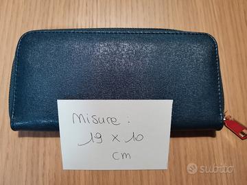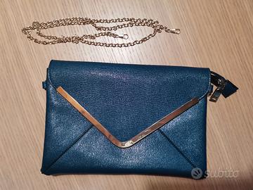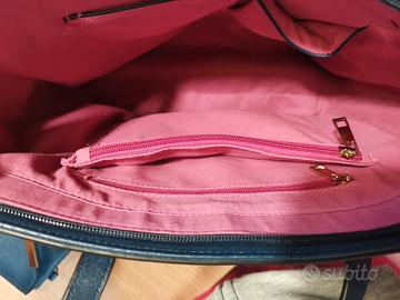 In similpelle blu. Interno in tessuto fuchsia. Dettagli in metallo dorato.