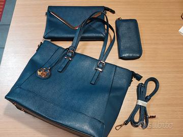 Trio borsa shopper a spalla, con manici e tracolla, bustina a mano/tracolla e portafogli/portadocumenti.