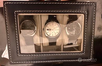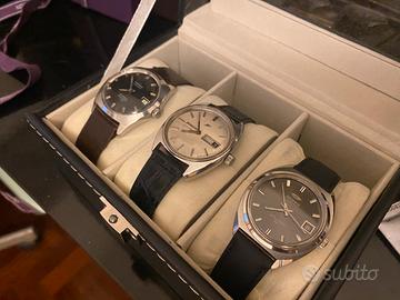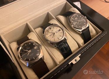 1. Mondia Skystar 25 Questo modello è un classico degli anni '60/'70. Mondia era un marchio svizzero di solida reputazione che, nel 1969, entrò a far parte del gruppo Mondia-Zenith-Movado. • Caratteristiche: Movimento meccanico a carica automatica (probabilmente un calibro AS o ETA) con 25 rubini. • Design: Presenta un quadrante grigio soleil molto elegante e una cassa "tonneau" tipica dell'epoca. La dicitura "T Swiss Made T" indica l'uso del trizio per la luminescenza degli indici, oggi virato verso una piacevole patina vintage. 2. Enicar Automatic (Day-Date) Enicar è un brand storicamente molto apprezzato dai collezionisti per l'indipendenza tecnica e l'iconico logo del pianeta Saturno. • Caratteristiche: Questo modello presenta la complicazione Day-Date (giorno e data) a ore 3. Spesso montavano calibri di manifattura (serie AR), famosi per la loro robustezza. • Design: Cassa in acciaio dalle linee pulite e quadrante argentato con indici a bastone applicati. È un tipico "everyday watch" d'epoca, sobrio ma costruito con standard qualitativi elevati. 3. Tissot Visodate Seastar T.12 Il T.12 faceva parte della linea più robusta e sportiva di Tissot tra gli anni '50 e '70. La sigla "T.12" originariamente indicava una resistenza alla pressione di 12 atmosfere (120 metri), un valore notevole per l'epoca. • Caratteristiche: Movimento automatico con datario (Visodate). La cassa è più massiccia rispetto ai modelli precedenti, pensata per una maggiore impermeabilità. • Design: Bellissimo quadrante nero lucido con indici applicati "chunky" e lancette a bastone. È l'orologio dei tre con l'estetica più decisa e "tool-watch", molto ricercato nella sua configurazione originale. In sintesi, si tratta di tre pezzi che illustrano bene la transizione del design svizzero verso forme più geometriche e l'uso di complicazioni pratiche per la vita quotidiana dell'epoca. La scatola a tre slot è compresa nel prezzo.
