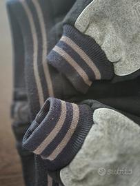 Triumph Motorcycle Bomber College XL. Colore nero intenso e grigio in foto il nero sembra più chiaro ma in realtà è un nero vivo , inserti tasche in pelle , scritte e loghi ricamati , interno con fodera e imbottitura , originale triumph .