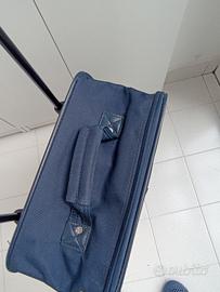 Vendo trolley colore blue navy usato ma in buone condizioni, tenuto con cura. 2 rotelle, manico telescopico, con lucchetto in dotazione. Le misure sono h 53, l 35, p 18. Il prezzo è 10€ non trattabili.