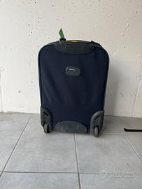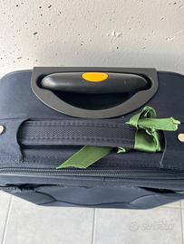 Vendo trolley morbido originale Valigeria Roncato, colore blu scuro con interni a contrasto gialli. Dimensioni ideali come bagaglio a mano per la maggior parte delle compagnie aeree. Dimensioni: circa 55×40×20cm (misure standard cabina). Interni: Organizzatissimi, con divisorio in rete, tasche con zip e cinghie ferma-abiti. Struttura: 2 ruote grandi incassate (molto resistenti) e manico telescopico a scomparsa. Stato: In ottime condizioni generali, interni pulitissimi. Leggera e maneggevole.