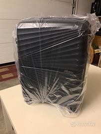 BAGAGLIO A MANO/CABINA CON MISURE RICHIESTE DALLE MAGGIORI COMPAGNIE AEREE: 50x40x20 cm - 38L / 2,7kg Trolley in polipropilene guscio rigido, doppie ruote girevoli a 360°, doppio scomparto interno con cerniera portaoggetti, elastici ferma abiti, fodera interna, chiusura TSA con codice personalizzabile. Vendo 25€ causa doppio regalo.