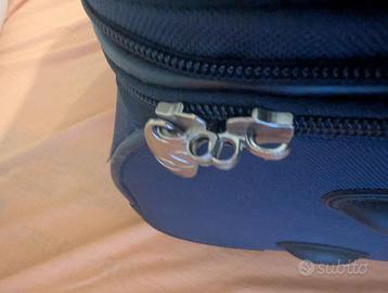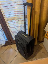 Trolley Caleidos blu scuro con due ruote e manico telescopico. Dimensioni 34 x 21 x 52 cm, peso 3,1 kg. Modello espandibile con due tasche frontali e vano principale con cinghie interne. Fodera logata. In buono stato: manca un cursore della zip ma l’altro funziona perfettamente. Ruote e manico in ordine. Ideale come bagaglio a mano.