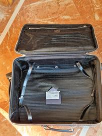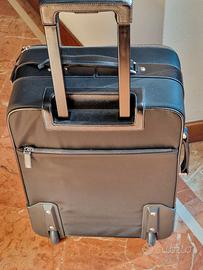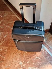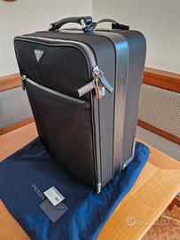 Raffinato trolley da uomo di Prada a quattro ruote, formato cabina, realizzato in nylon e pelle Saffiano con tasca esterna e portanome rimovibile. Maniglia in pelle. Logo triangolo in metallo smaltato sul davanti. Chiusura con zip e lucchetto. Portanome in pelle rimovibile. Una tasca esterna con zip. Sul dietro, manico telescopico. Interno con lacci in pelle e fibbia e con tasca zip. Fodera in nylon siglato. Fornito di cover. Dimensioni cm 56 x 37 x 23. Mai usato, condizioni pari al nuovo. Listino 2.900 Euro.