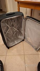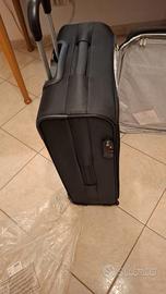 Il modello specifico è un trolley morbido. Apprezzabile per la sua leggerezza e funzionalità, dotata di scomparti multipli e ruote per una maggiore manovrabilità. Dimensioni: 44x65x25 Peso: 3,9 kg. Caratteristiche principali dei modelli simili: • Materiale: Tessuto morbido resistente (poliestere o nylon). • Design: Lo scomparto principale è dotato di cinghie fermabiti e tasche interne con cerniera per ottimizzare lo spazio. Presenta una tasca frontale con cerniera e un logo metallico discreto sulla parte superiore. • Espandibilità: la sezione principale è espandibile tramite ZIPper aumentare la capacità di carico quando necessario. • Serratura di sicurezza: serratura di sicurezza incorporata e dotata di