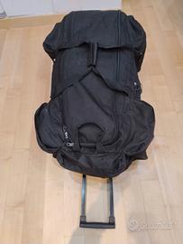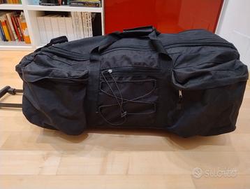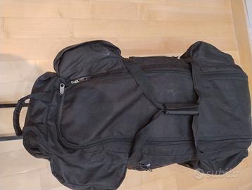 Trolley con ruote molto capiente in tessuto pesante Condizioni: con segni d'uso (qualche macchia nel tessuto) ma complessivamente funzionale. Dimensioni in centimetri (circa) larghezza 40, altezza 75, spessore 30 100 litri di capacità. Con 7 tasche laterali con cerniera Vendo per inutilizzo. Disponibile anche colore rosso in altro annuncio