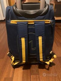 Segni d'usura: La parte inferiore dello zaino e le ruote mostrano normali segni di abrasione e usura dovuti all'utilizzo.