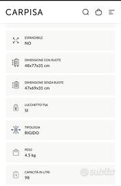 Vendo causa in utilizzo valigia Trolley L - Carpisa - Gotech green - Valigia Tsa. La valigia è stata utilizzata una sola volta e poi riposta, come da foto allegate. Condizioni perfette.