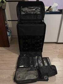 Vendo trolley organizzatore professionale con ruote e manico telescopico, ideale per truccatori, estetiste, parrucchieri, tecnici e professionisti che necessitano di trasportare strumenti e prodotti in modo ordinato e sicuro.