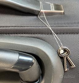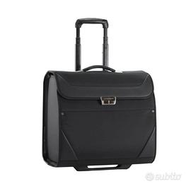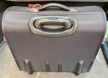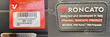 Trolley della prestigiosa marca “Roncato”. NUOVO con cartellino; mai usato, neanche una volta. Ancora imballato nel cellophane di fabbrica. Dotato di ruote in gomma con cuscinetti in metallo, scocca rinforzata e resistente agli urti, maniglione estensibile a due livelli, serratura e maniglia per il trasporto. Interno foderato, con 2 ampi scomparti e una tasca aggiuntiva per pc portatile, con sistema di sicurezza “antishock”. Lo scomparto principale si chiude con un fermo. E’ realizzato in robusto “Nylon 840d”, che resiste all'ammollo e alla luce solare. Pratico per uso quotidiano e viaggi. Ha le dimensioni di un bagaglio a mano e può essere portato a bordo di un aereo. Dimensioni e peso: cm. 45 x 40 x 23; kg. 4,20. Colore: nero. Codice del produttore: 401124. * PREZZO LEGGERMENTE TRATTABILE * Prezzo di listino dell’epoca: 229,60 euro. Visionabile in Torino e comuni immediatamente limitrofi. Preferibile la consegna a mano. Eventuali spese di spedizione a carico dell’acquirente.