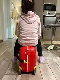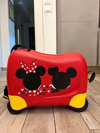 Valigia cavalcabile per bambini Samsonite Disney, soggetto Topolino e Minnie. La valigia è dorata di maniglie in tessuto e di un “guinzaglio” che diventa anche tracolla eventualmente.