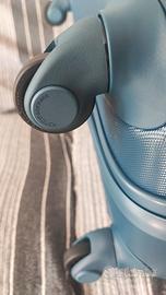 Trolley Mandarinaduck extra large rigido espandibile in policarbonato dal volume compatto e linee morbide. Presenta 4 doppie ruote in tono di colore che garantiscono migliore mobilità, protezioni d'urto in gomma personalizzate e piedini laterali antigraffio. La maniglia logata è appiattita in modo da non incrementare le dimensioni totali. Il TSA lock è posizionato sulla parte superiore per un accesso facilitato. Le grafiche interne sono rinnovate. Brand top di gamma, prodotto di alta fascia, valigia indistruttibile. Colore blu carta da zucchero. MAI USATA.