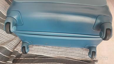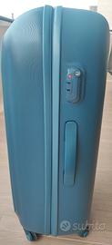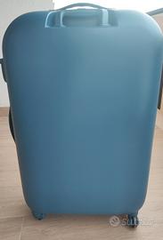 Trolley Mandarinaduck extra large rigido espandibile in policarbonato dal volume compatto e linee morbide. Presenta 4 doppie ruote in tono di colore che garantiscono migliore mobilità, protezioni d'urto in gomma personalizzate e piedini laterali antigraffio. La maniglia logata è appiattita in modo da non incrementare le dimensioni totali. Il TSA lock è posizionato sulla parte superiore per un accesso facilitato. Le grafiche interne sono rinnovate. Brand top di gamma, prodotto di alta fascia, valigia indistruttibile. Colore blu carta da zucchero. MAI USATA. Altezza (escluso ruote) 74 cm Larghezza 52 Profondità 28 Le misure sono approssimative perché la valigia è bombata arrotondata PS purtroppo subito non permette di spedire con queste dimensioni. il preventivo che ho avuto da un corriere è di 24 euro con GLS, mentre con poste italiane 20 euro