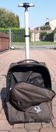 Caratteristiche: barra singola telescopica con doppia regolazione; ruote da 75 mm; spallacci a scomparsa totale nello schienale e e sollevati grazie al cross-over system quando utilizzato come trolley; fondo preformato integrato per garantire la stabilità del prodotto e la protezione del contenuto