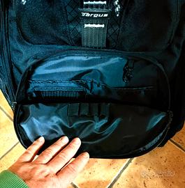 Trolley multifunzione. Trasformabile in zaino chiudendo la maniglia e spostando una paratia che scopre gli spallacci e va a coprire le ruote. Nero. Nuovo, mai usato. Dotato di borsa interna separabile per il trasporto di un notebook fino a 16” (39.1 cm max). Dotato di 2 scoparti principali, porta documenti rigido, diversi scomparti minori sia elastici che con chiusura a cerniera. Tasca laterale porta bottiglia.