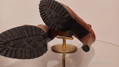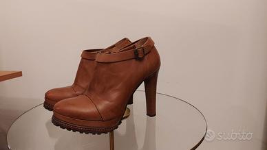 Scarpe grintose in pelle color cognac, con plateau di 2 cm e tacco 11 cm, perfette sia con pantaloni che con gonne o vestiti. Indossate 3 o 4 volte, vendo per inutilizzo. Non presentano graffi esternamente, solo all'interno presentano dei segni di usura, come si vede dalle foto. Hanno una suola di gomma con carro armato, che ne permette l'utilizzo anche sul bagnato. Bellissime, vi farete notare sicuramente (le avevo cercate ovunque dopo averle viste indossate da un'amica ad un evento).