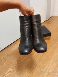 Tronchetti in pelle scamosciata nera e in pelle metallizzata canna di fucile, tacco largo e comodo 9,5 cm, cerniera laterale, punta quadrata, marca Janet &Janet, numero 38. Usati pochissimo, condizioni perfette. Ideali anche per gli outfit di Natale e Capodanno